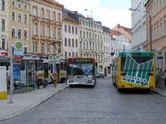 Görlitz – punkt przesiadkowy w centrum miasta. Autobusy i tramwaje czekają na siebie, aby umożliwić przesiadkę. Ulice są zamknięte dla ruchu kołowego.